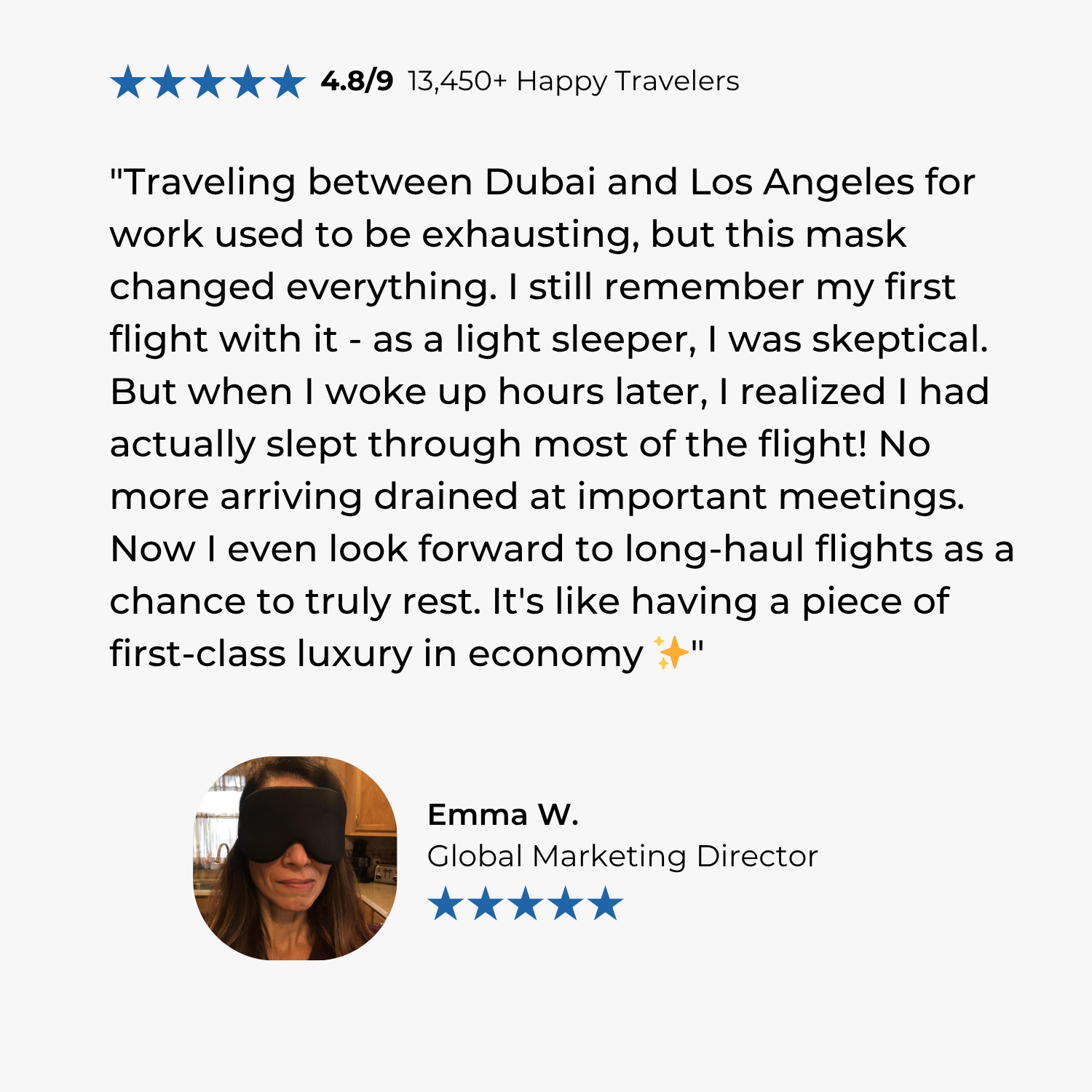 "This mask is a revelation! I'm a light sleeper and used to struggle with cabin lights. Used it on my NY-London flight and slept the entire way. The floating design means no pressure on my eyes or makeup. Genius!"